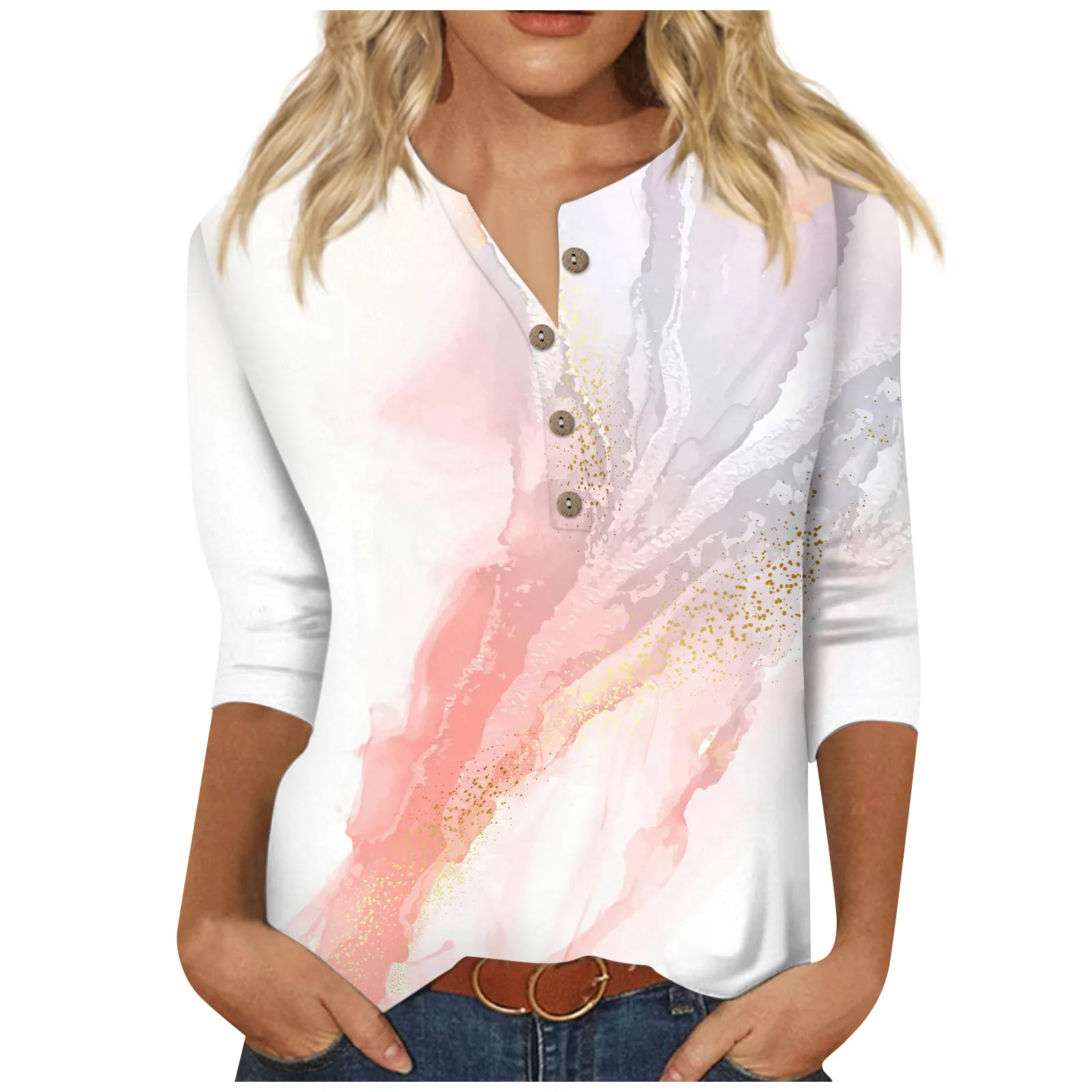 V Neck Women’s Blouse: 3/4 Sleeve Print Casual Top