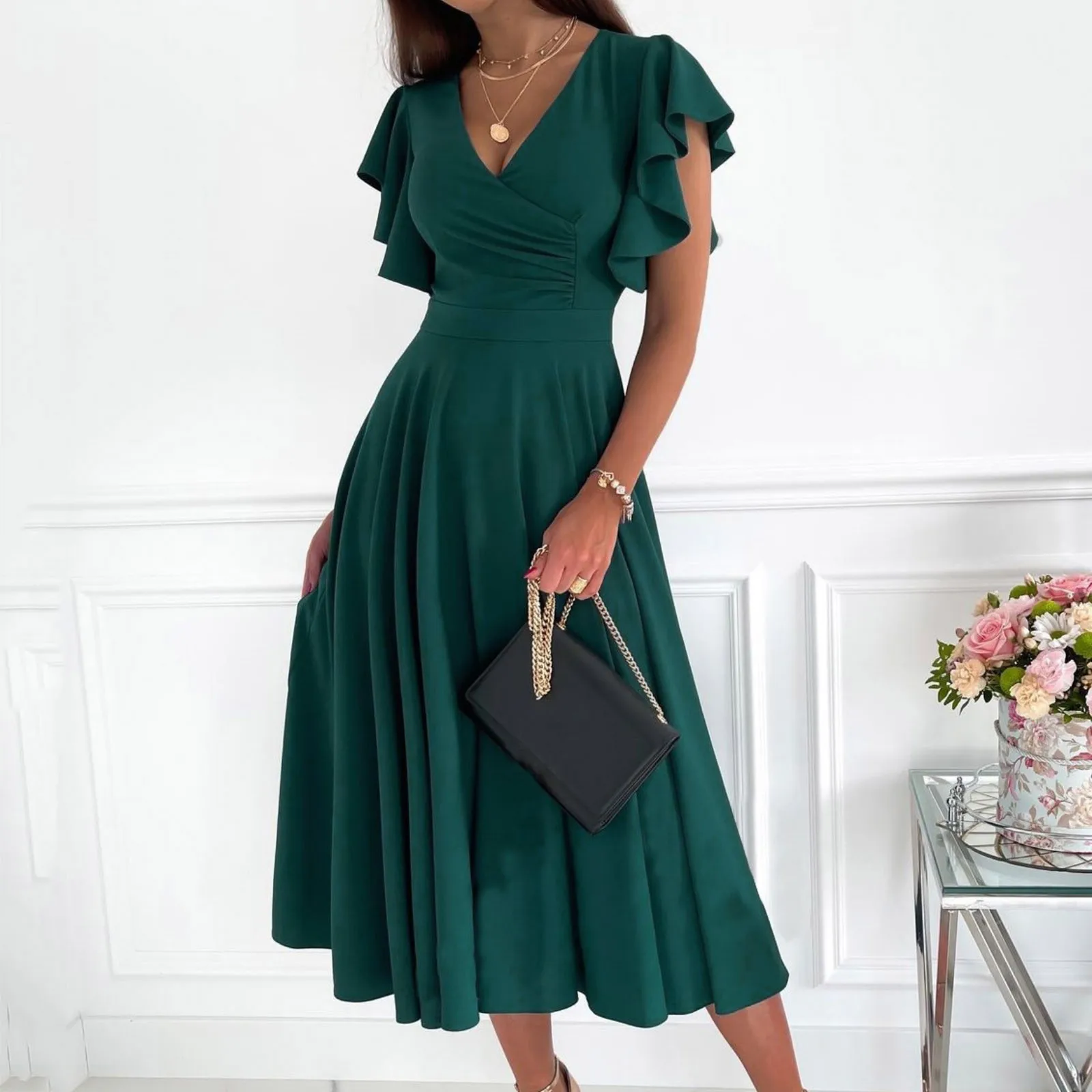 Solid Color A-Line Midi Dress: Short Sleeve, Elegant