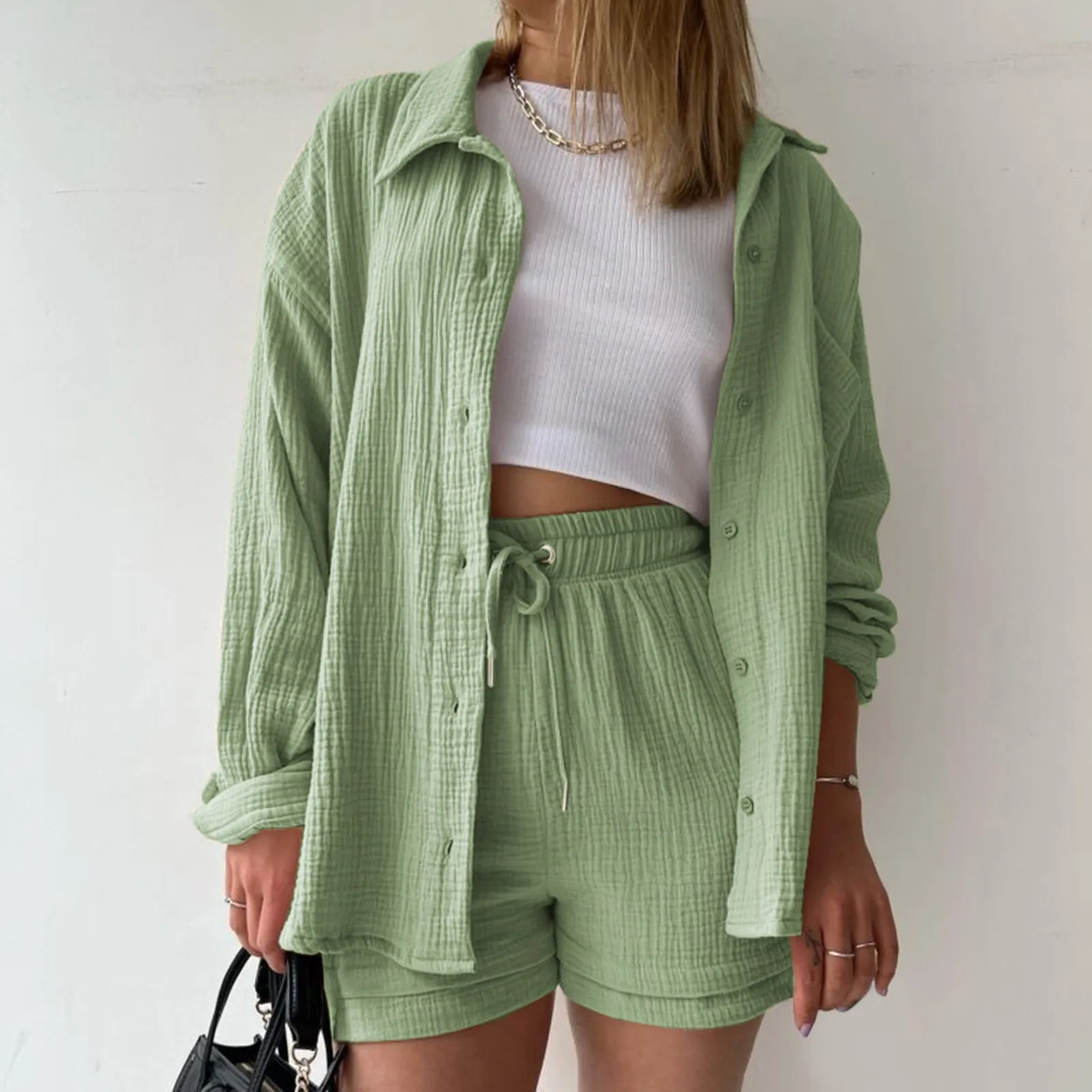 Solid Pleated Two Piece Pajama Set – Long Sleeve Shorts