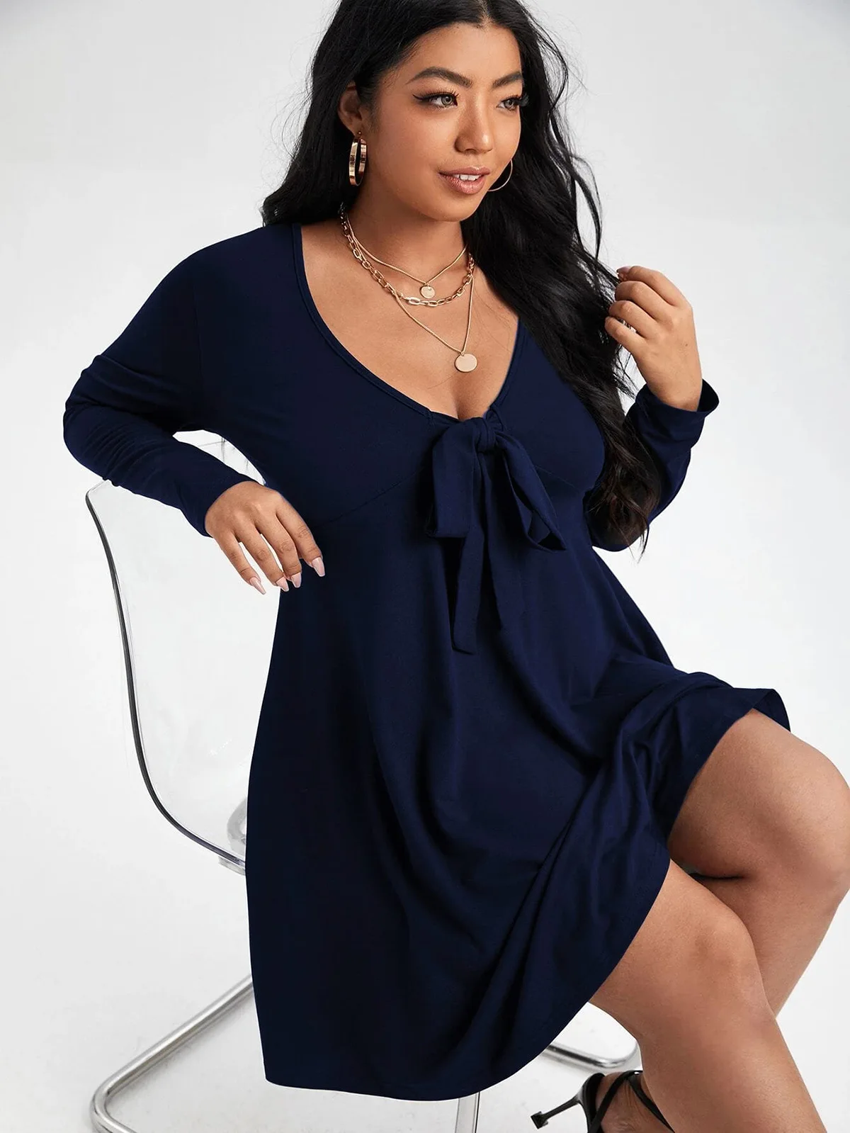 2022 Plus Size V-Neck Bow Tie Dress: Comfortable Autumn Wear