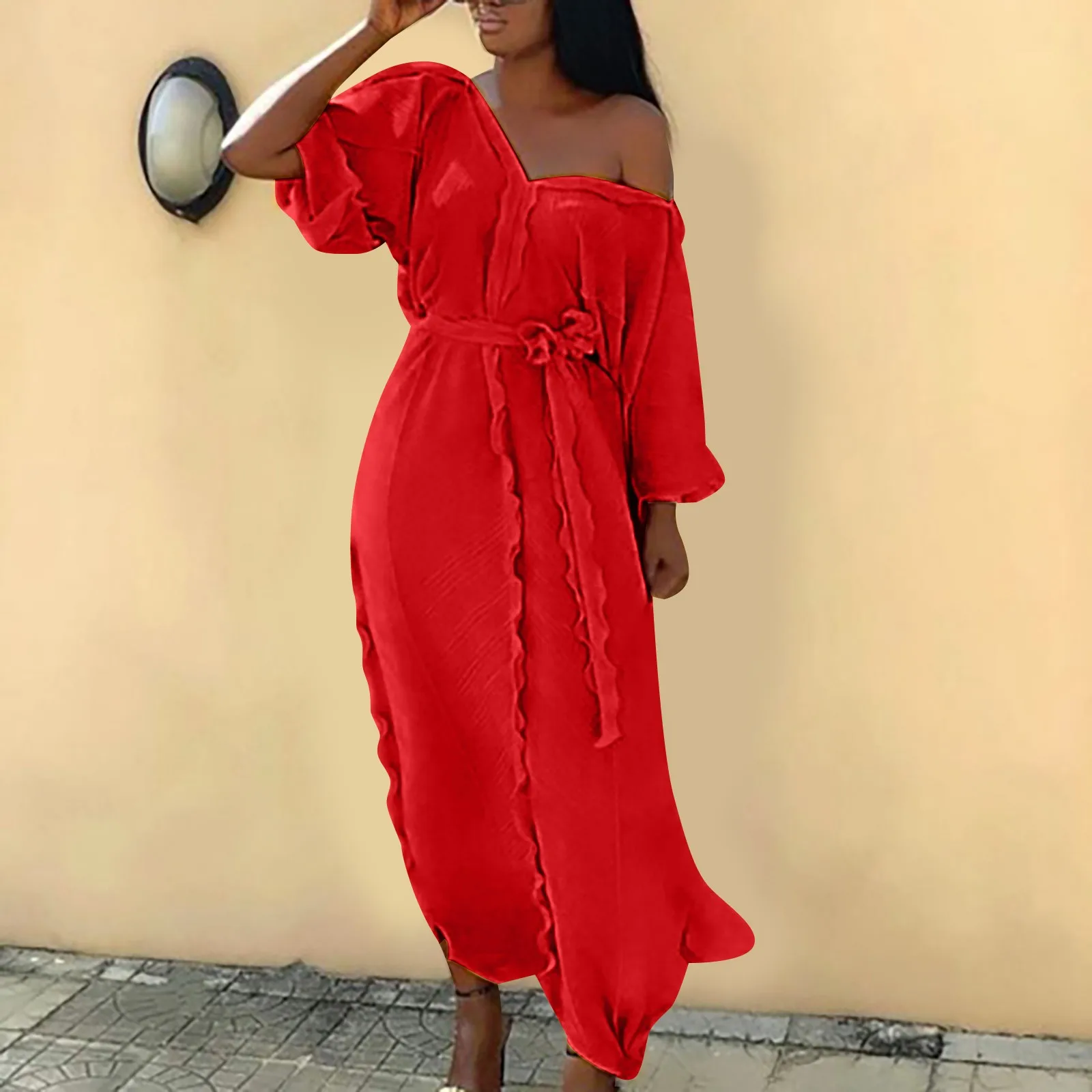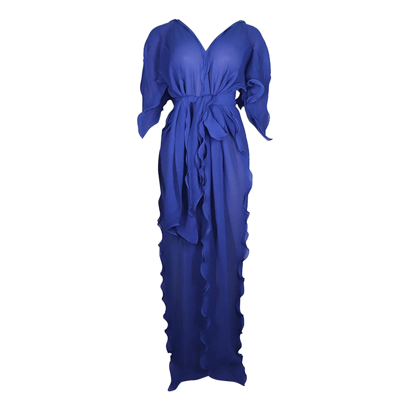 Ladies Sexy V Neck Pleated Ruffle Pearl Chiffon Loose Flowy Dress