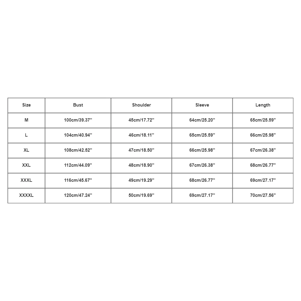 Size:XXXXL Bust:120cm/47.24” Shoulder:50cm/19.69” Sleeve:69cm/27.17” Length:70cm/27.56”