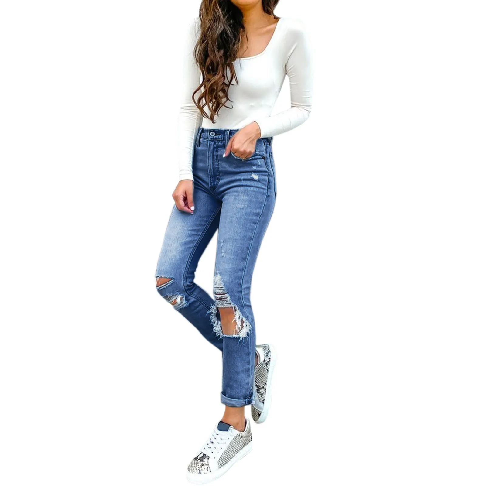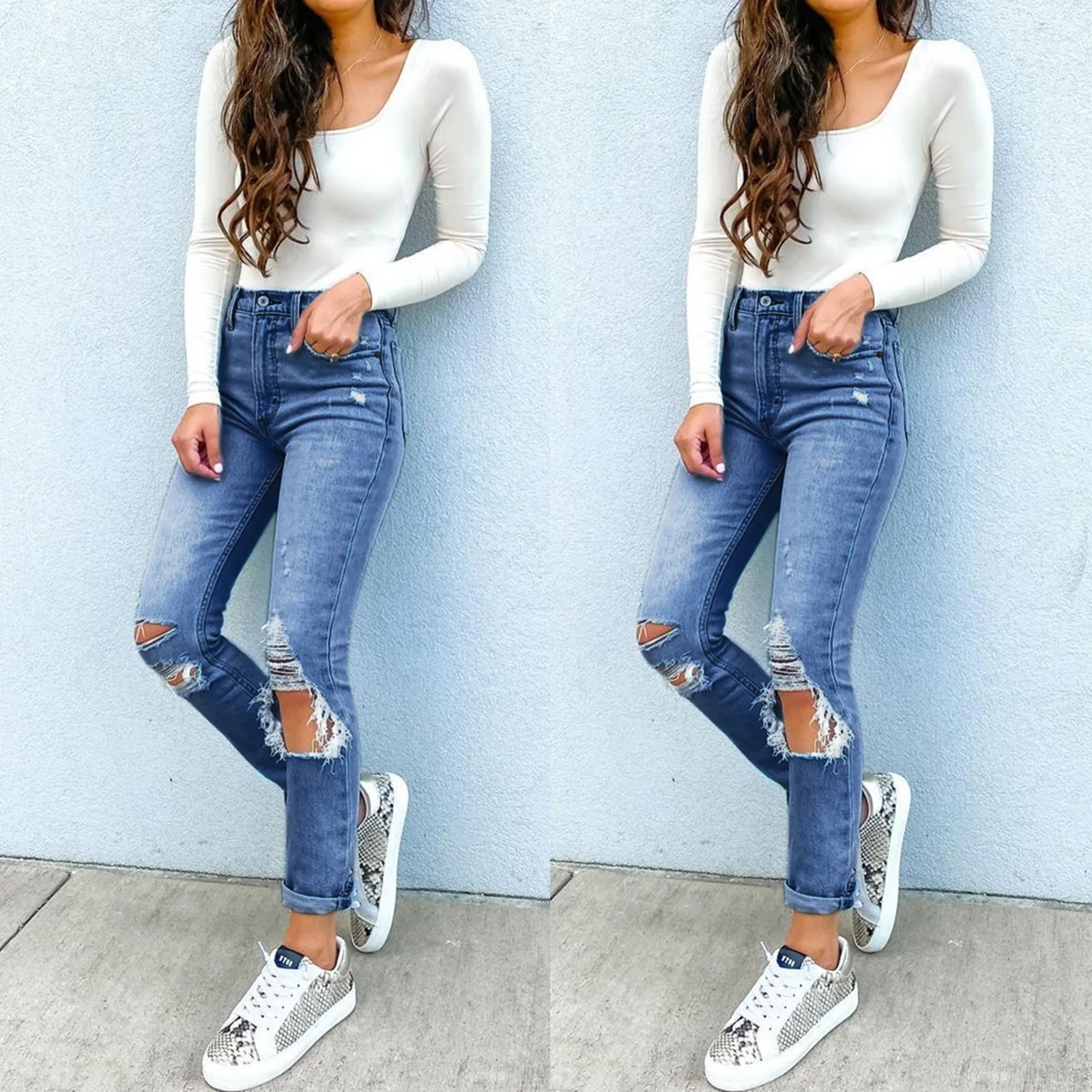 Women Jeans Solid Color Blue Denim Trousers With Ripped Pockets