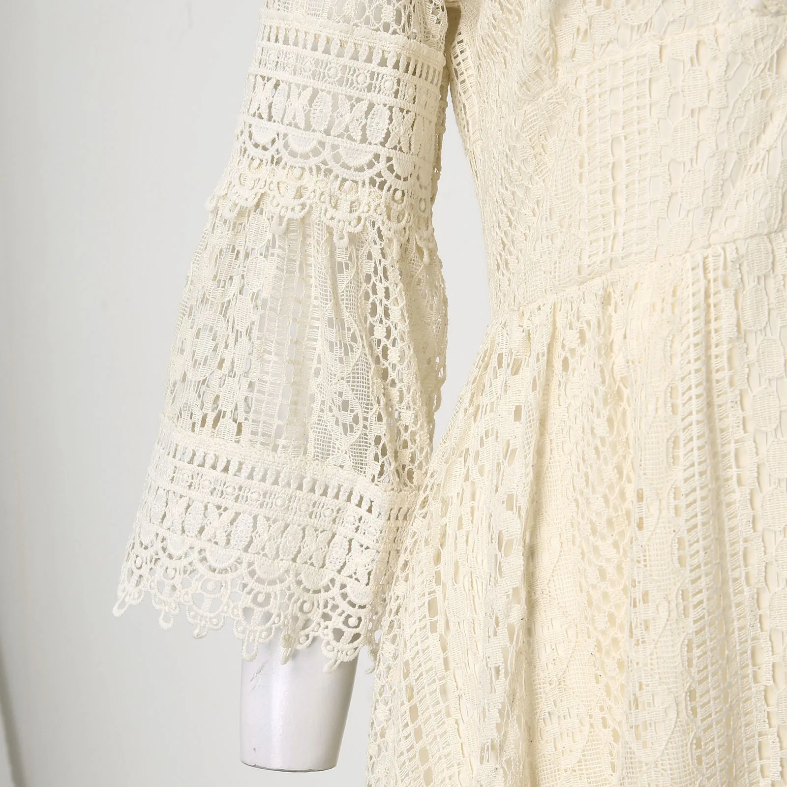 Womens Solid Color 3/4 Sleeve Dress V Neck Hollow Lace Flare Sleeve Dress
