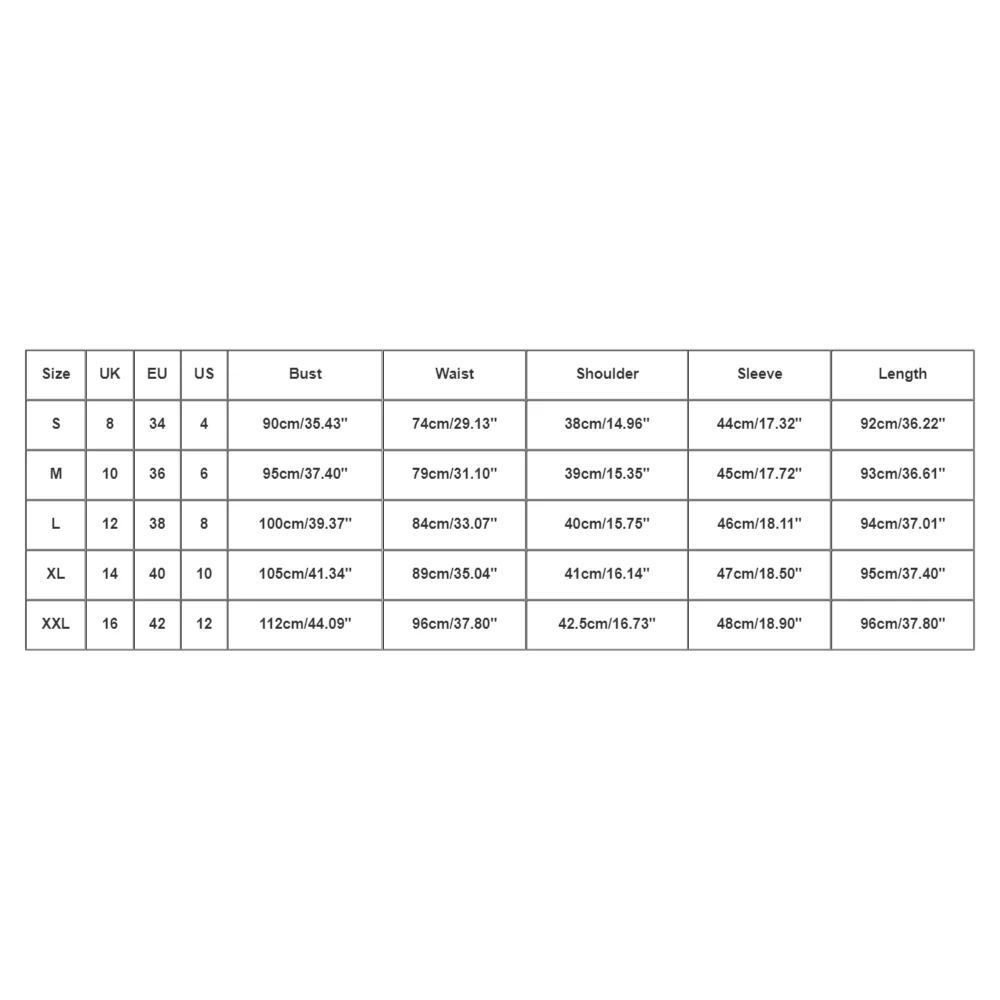 Size:XXL UK:16 EU:42 US:12 Bust:112cm/44.09” Waist:96cm/37.80” Shoulder:42.5cm/16.73” Sleeve:48cm/18.90” Length:96cm/37.80”